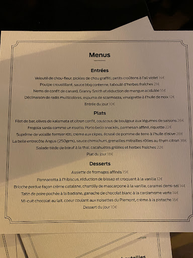Read moreAlthough the service was really good, the staff was courteous and nice, the vibe of the place wasn't all that. It was supposed to be festive, but the dj didn't really lit the place up. I don't know if we came at a wrong time, a few days before new year but me and my friend were disappointed. As for the food, my friend liked her dish and the portion was generous. She ordered the filet de turbot. I on the other hand, wasn't very satisfied with my entrecôte considering the price of it (42 euros). The meat was good and tender but more à point than saignant while I ordered saignant. That wasn't really the main issue cause the meat was still tender and good. It's the polenta that really ruined it for me. The thing was really dry with no taste. My friend tasted it and shared my opinion. It's a pity to pay as much for the food and have neither excellence in quality nor at least a good vibe to compensate. If I had paid less than 30 euros on the plate I wouldn't be nagging but the experience overall on that night was overpriced for...