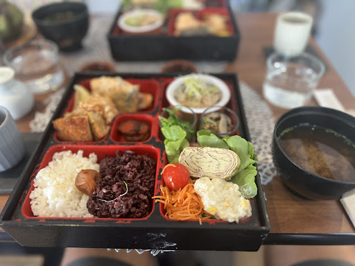 This was a lovely find. My daughter loves everything Japanese and I wanted to surprise her on our last day in Paris. We almost missed the place, it's rather small. Inside was bright, simply decorated, and calm. We got there much later than I expected and I was afraid they would no longer serve savoury food but I asked the owner and it was no problem. Everything was cooked fresh so it took a bit of time, but it was really worth it. The ladies were very understanding when my daughter explained that she can't have dairy and asked if she could choose a cake for me in a take away box instead. Good choice, it was delicious, I ate it on the plane 😊 We had a bento box and a vegetarian bowl. It was generous, fresh and tasty. Matcha tea and sesame latte were...