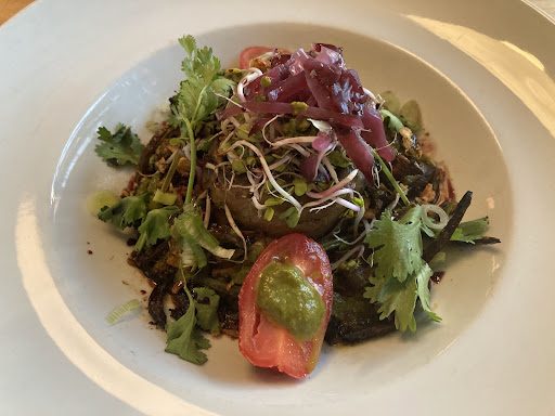 House special ‘gyoza’: made from mushrooms.. somehow has an Asian twinge to it! Includes algae, green tea, Asian (likely japanese) oyster mushroom .. and secret ingredients of the chef.. suspect contains coriander, parsley, basil.. mind bending. Garnishee with mushrooms on top