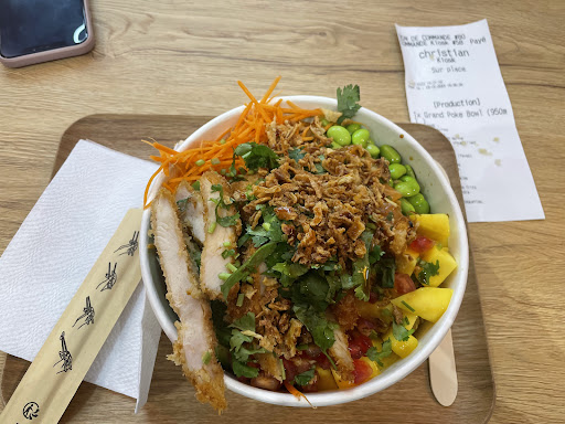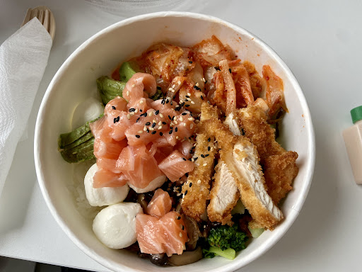 J’ai pris un poke bowl 750 ml (les petits suffissent largement, les quantités sont très copieuses ) avec riz, saumon, mozzarella, edamame, mangue et kimchi, cacahuète et soja sucrée. Tout les ingrédients sont de qualité, servis généreusement et rapidement ( il y a un système de borne très pratique). Décidément un bon rapport quantité/ qualité/ prix ( en tout cas hors menu, j’en ai eu pour 11,90). Bonus, il y a un grand choix dans les ingrédients et les sauces dont certains que vous ne trouverez pas ailleurs à mon avis !