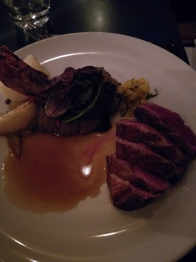 The place had nice ambiance, the service was okay. It could have been better. The food was lack luster at best.. We ordered an appetizer and two entrees. The presentation was nice on all the dishes but the flavors were unbalanced. The hummus and leaks appetizer felt like an afterthought of flavors. The hummus and the nori and tapioca chip and togarashi and this mix just didn't work well. The cold hummus with the supposed to be warm leek didn't work. The tapioca chip got soggy on top of the hummus (this dish felt like a party appetizer gone wrong). The second dish I was not able to appreciate was the spinach, potatoes, yogurt, curry and cheese. I think it was a failed attempt of creating a deconstructed Aloo Palaak. This plate was a disappointing mess. Here the play of temperatures were off. What should have been hot was served lukewarm and the cold was just at room temperature. This dish did not feel like an entrée and more so like a appetizer. The four cheese sticks and four pieces of small potatoes with dallops of yogurt and spots of curry and spinach smear was just not worth 18 Euro. I wished the cook would have truly worked on the flavor balance on this dish. The curry dots and I say dots accurately, just clashed with the few pieces of vinegar onions. This dish made me upset to have ordered it. It did not transport me to a good culinary experience. The other entrée we ordered was the duck magret. This was the less disappointing dish of the evening. The duck was nicely cooked. The mush of mushrooms was not very pleasant. The spicy pineapple salsa clashed with the mushroom puree and then there was a chard and a turnip a potato and some leaf placed on the plate. I didn’t appreciate the overall disjointed approach to these dishes. They lacked a sense of cohesion and were mostly a dissonance of flavors, textures (or lack of), and, temperatures gone wrong. This meal was truly not worth 49 Euros. Food should nourish and elevate your mood not dampen it. For that, I wouldn't...