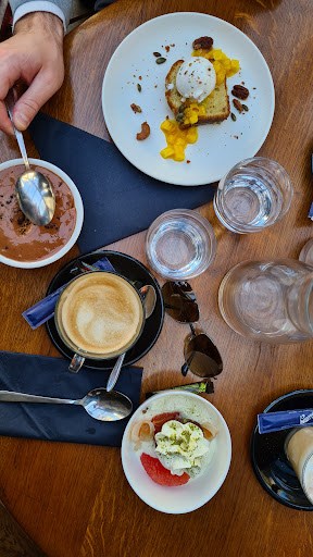 Food was delicious! Coffee was quick and they had many kinds of fresh squeezed juice. For food, we shared the razor clams made with lots of fresh herbs (dill, parsely) and pomegranate. They have delicious (house made?) bread for the table. I have smoked salmon and eggs. The eggs were smooth and creamy. The potatoes were perfectly crisp and salty on the outside soft on the inside. The pickled veggies inside were delicious! My partner had the fish n chips and they're homemade tartar had fresh herbs. Dessert was nice. The tables around us (seemed local) and were having champagne. We'll have to try...