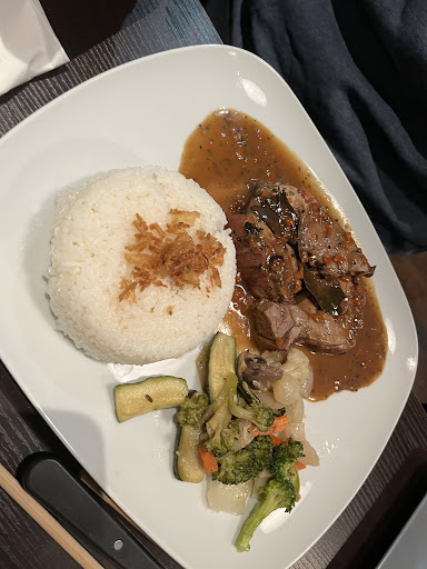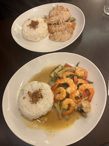 Read moreOn est venu deux fois la semaine dernière Le même jour Le midi on voulait manger un bo Bun au bœuf et aux nems mais pas de nems on a changer nos plan Après des bouchés vapeur aux crevettes excellentes Je pars sur un pavé de saumon avec un gratin dauphinois le poison un peu trop cuit à mon goût mais d’une grande saveur le gratin fait de façon traditionnelle saveur de muscade les pommes de terre fondante juste manque un peu de crème sinon ma grand-mère était en cuisine Mon convive lui part sur un faux filet bien cuit avec des frites maison c’est un régal rien à voir aux des frites congelées Le tout accompagné d’une bière vietnamienne la Saigon léger mais avec du goût Et pour sortir un café bio on en a repris