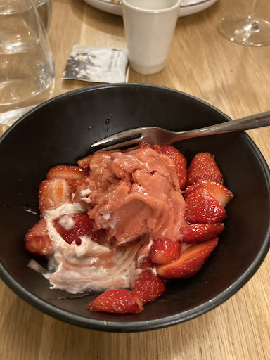 On to the food…The grilled octopus salad was beyond amazing. Cooked perfectly and with such flavor. The chicken and polenta was so tender and the 7 hour cooked lamb was to die for. The portions were absolutely perfect. Dessert was a marvelous ending - Fraise Gariguette with fresh local strawberries, house made sorbet and cream and the Mille-feuille was so light and tasty. Simply perfection. Coffee and tea finished off a perfect evening. Did I mention the champagne?? Don’t forget to start with a glass!!