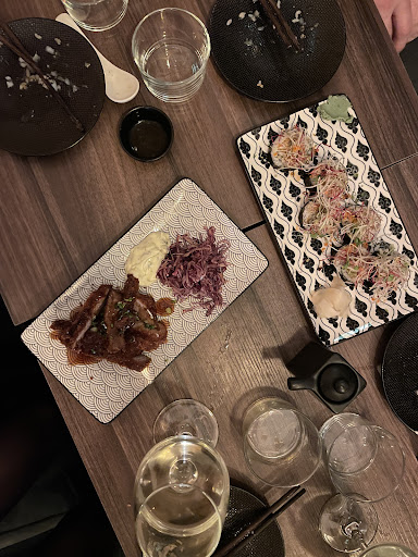 This was a great experience and we don’t understand some of the negative reviews about the service because we were super well attended to by the wait staff and the chef. Perhaps this is because we ate at the stools at the bar facing the chefs. Each dish was a very delicate and delicious experience with innovative flavors (see the pictures and captions that we added) and great attention to detail and very nice presentation. There were two instances where the added sauces could have been avoided: the tartar sauce with the pork and the mayo sauce with the tuna tacos. The atmosphere is pleasant with Japanese prints all over the place. Highly recommend this restaurant. Rather good price...