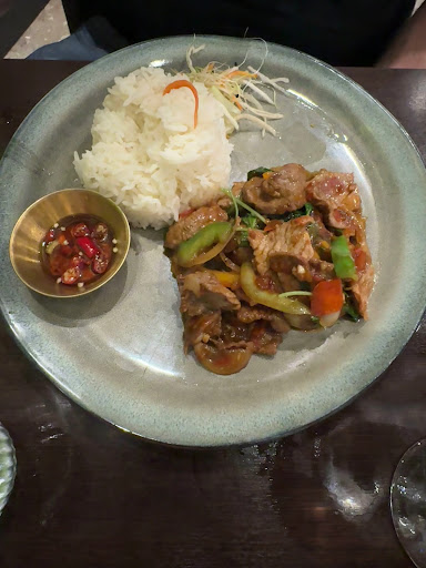 What a great find this restaurant was! Delicious food and lovely staff. We had the octopus to start (yum!), followed by the king prawns with lemongrass and kafir lime, and the green chicken curry lasagne. The king prawn dish only had 3 prawns on it, which was disappointing for the price (but maybe that’s usual in Paris? 🤷🏻♀️), but it was very tasty. We wanted to try the lasagne as it seemed such a strange combination. We were not disappointed. You would think that it shouldn’t work, but it does! Really delicious! We loved the little extra touches such as an amuse bouche after we’d ordered, and a traditional house-made Thai digestive at the end of our meal. Would definitely recommend...
