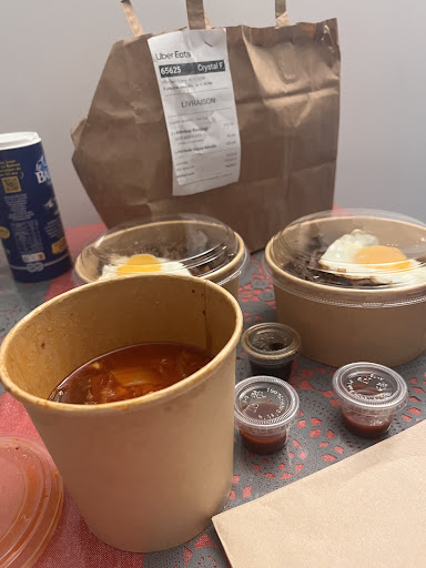 This is a small Korean restaurant managed by 2 sisters : one is the chef and the other one handles the orders. You can talk to them in French, English and Korean if you can. We went there at the opening so it was not busy at all. You can either do a take away or eat there as there are a couple of tables and seats. The menu is quite limited but just enough . It feels like a home cooked meal so you feel at ease. We tried the jeongsik meal which comes with a bowl of rice and 3 side dishes. You can pick between 3 main protein. The food was pretty tasty but I did wish the portion of the side dish would be a bit more.
