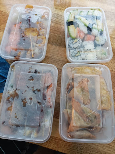 Read moreTrès déçus par notre réservation Too good to go, nous avons eu 2 barquettes déjà prêtes alors que nous avions ramené nos propres tupperwares, nous nous attendions a avoir les invendus du buffet du soir mais c'étaient vraisemblablement ceux de la veille! Rien de ce que nous avons eu ne nous a plu. Le pire étant les sushis qui malheureusement étaient saupoudrés de piment d'Espelette et nous n'avions pas été prévenus, nous n'avions pas vu. Dieu soit loué il était tard et nos enfants étaient couchés car nous avions l'intention de manger en famille, avec nos enfants de 5, 4 et 1an. Donc imaginez un peu si le bébé avait manger un sushi au piment !!! J'ai eu la bouche en feu pendant une bonne heure. Nous avons tout jeté. Nous avons eu plein plein de moules farcies, une vingtaine de frites toutes sèches, un bout de pavé de saumon tout sec collé à du poulet au caramel tout gras, avec du riz sans aucun goût, un seul nem tout petit et tout sec également, 4 maquis et 2 cornets type maquis et 2 galettes de pommes de terre. Bon pas de chance j'ai croqué un sushi en premier. J'ai goûté vite fait le reste mais comme j'avais la bouche en feu voilà j'ai rien apprécié. Mon mari a seulement mangé les 4 maquis et voilà. Nul! On recommande pas dutout....