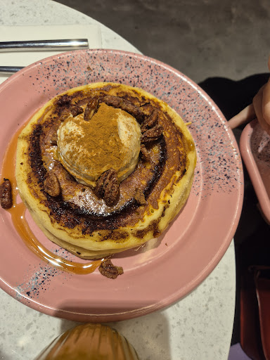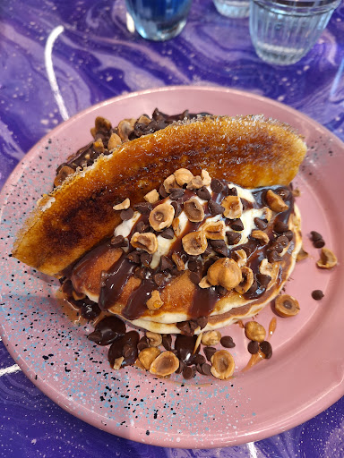 What a delightful experience at this charming brunch spot! The staff were incredibly friendly and welcoming, setting a pleasant tone from the moment we walked in. The interior is absolutely Instagram-worthy, with its adorable purple theme that added to the overall ambiance.But the best part? The food, of course! The portions were generous, and we thoroughly enjoyed everything we ordered. The milkshakes, both the blue and pink varieties, were creamy and delicious. The Italian chicken burger was flavorful, the pepperoni toasts were a nice savory touch, and the pancakes... oh, the pancakes were simply amazing! Chocolate, nuts, mascarpone and half a grilled banana on top We left feeling so full and so happy, already planning our next visit. If you're in Paris and looking for a great brunch spot, definitely give this place a try. You won't be...