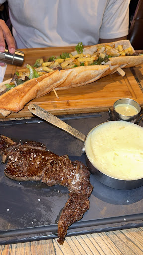 This is a first-rate steakhouse with a solid meat first and second, everything else third vibe. The decor is minimal in the extreme and the service, once you get past ordering off a notepad that has been bolted to the table, is friendly and efficient. With the meat the star of the show for both starter and mains, the only real option is your preferred degree of doneness. Rare does come out very rare, perfectly one step from moving. Side dishes and sauces round out the only options and are very limited. Something green other than rocket salad would be appreciated and the mashed potatoes were tasteless despite an overload of butter. Simple but good tarte rounded out the meal. Overall very good, very...