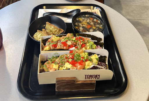 Out of the three sushi tacos, the chicken one and the tempura shrimp one were very good. The last one, with cooked tuna and raw vegetables, was less to my taste. I didn’t really like the combination of thinly sliced apple, cooked tuna, and cucumber. But that’s just my personal preference—you might like it!