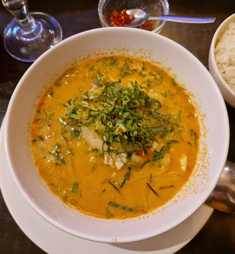 Read moreAccueil amusant au départ mais au fil du repas, les "blagues" du gérant deviennent superflues... Nous étions deux amies pour le diner. J'ai trouvé la qualité des plats vraiment médiocre. Les crevettes curry rouge pourtant très alléchantes sur le site et sur la carte sont en fait de très faible qualité cela se sent au gout et la sauce curry s'apparente finalement à une soupe à l'eau. Les brochettes dites "satay" n'ont rien à voir avec les véritables. Le riz gluant coco-mangue en dessert était bon. Effectivement ce n'est très cher et cela se ressent dans la qualité des produits. Au niveau du service il fallait faire signe pour que l'on vienne nous débarrasser, cela ne dérangeait pas de nous laisser avec les entrées ainsi que les plats terminés sur la table. Je déconseille cet endroit car pour le même prix ou quelques centimes de plus, on trouve dans le quartier la même cuisine de qualité nettement supérieure. La recherche de profit se ressent dans l'assiette. Addition tout de même à 25...