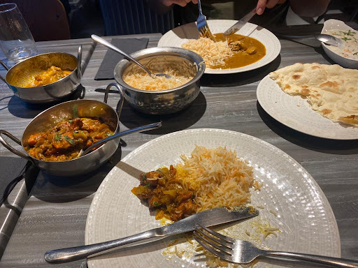 Stylish, easygoing restaurant plating Indian dishes, such as curry & chicken tikka masala.
