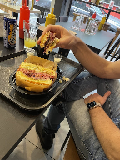 We ate here on 12 Jul 2023. It was fun and they were very welcoming and the decor is fun - a little dark - there are zombies on the wall - real painting! I hope that you try this place. I like their concept. This is the second of their restaurants which first started in the 15e . Anyhow the owner was kind, he spoke both french and english. FLUENTLY. He was kind and he was so careful in the preparation of our sandwich. Just watching him was a pleasure. He grills the sandwiches inside parchment paper - it's cool. I had the 50/50 which was excellent and has pastrami and pastrama (50% and 50%) and... special sauce, onion confiture and arugula and pickles. It was delicious. The portion size was so large you could split it and have it for lunch or dinner the next day. (Just like Katz's deli in NYC) My companion had the Le GOAT. It is pastrama with goat cheese - and crispy onions and fig confiture. He loved his as well. Both are excellent. His is cheaper by about 2 euro. So... 50/50 if you want pastrami, and save 2 Euro if you just get the pastrama. Both are super good! I highly recommend this place and run don't walk to them. Eat here as much as you can. If you use the (La fourchette) FORK then you get 50% off the carte price - a SUPER DEAL! PLEASE...