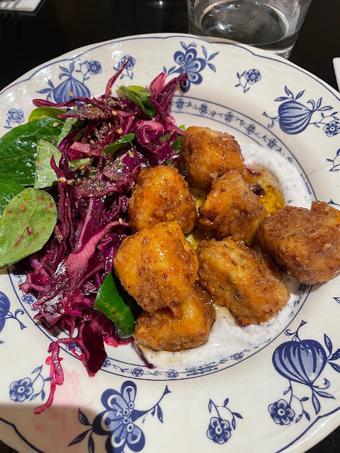 Small joint in the 19th district, nice decor, not too crowded seating. Levantine cuisine with a twist, intriguing enough to try the meals. We had 4 entrées and 3 mains: The hummus fatteh was absolutely delicious, almost as authentic as can be! Halloumi croquettes were also very tasty. Hummus and baba ghanouj were both bland, lacked flavor and the texture was a bit wrong. The pulled pork was exquisite, very nicely cooked, rich in mediterranean flavors. Mantis was also good, dough a bit undercooked but very tasty. The chicken was ok, still tasty but no twist and nothing fancy. Dessert wise, had the sumac brownie: weird deep woody flavor, nicely complimented by the side ice cream (close to vanilla). Also tried the mille feuille: sort of revisited cheesecake, quite tasty with its almond praline. Both lebanese wine bottles were a nice touch to accompany our meal: 2021 Plaisir du vin was light and fruity, whereas the 2017 Reserve Famille was deeper, woody with a richer body (went smoothly with the pork).