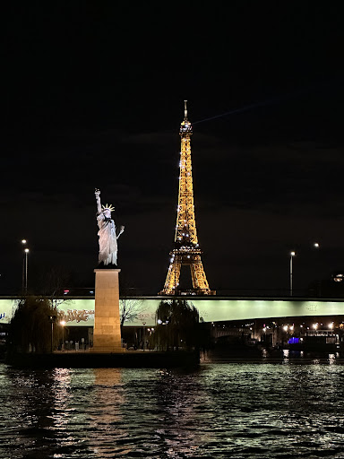 Can't see out of the boat late at night because the lights in the dining area are too bright; you see your own reflection instead of the Paris scenery, see picture of Eiffel tower and other guests reflected. Music was radio with commercials, when in range, that significantly disrupted the atmosphere since the volume was inconsistent but always quite loud. It would abruptly end and then a different track at a different volume would resume. Quote and low volume during these in between moments had a buzzing due to bad wiring, like the lighting.