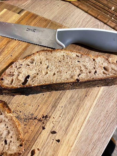 To move to the actual quality of the products, there’s something missing, regardless of the materials they’re made with. Baguettes are flat, and shorter than most other places in the city. Today I bought a meule that was burnt yet still undercooked in the center and flat, and little balls of dough formed when it was cut, a nearly impossible task because the crust was like a rock.