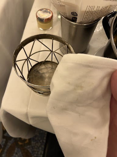 This restaurant is absolutely beautiful. It is over 100 years old and should be treated with the respect that it’s history deserves. Unfortunately it currently isn’t. The layers of dust around the backs of the tables was the first sign that the current management could care less about the place. When we asked our server questions about items he said it’s his first day working here and had no idea and had to ask someone else. These red flags should have made us walk out immediately but based on the reviews we wanted to give it a try…. Huge mistake! The mussels were horrible… I could have made them better myself at home and I have no culinary experience. The pictures and video show what my napkin wiped out of the bread basket… brown , black and green… colors you should never see associated with something that touches food you are supposed to eat. The mussels had almost no broth, so the mussels had absolutely no flavor… honestly beyond disappointed about this experience. i sadly would compare the quality of this restaurant to a truck stop diner in America. Shame on them for neglecting this beautiful establishment. Shame on them for serving food and drinks in a way that can only be described as unsanitary and unacceptable. Service was horrible. Food was horrible. Ambiance was horrible. Dim the lights… light some candles or something to make it not seem like a shopping mall. If they ignore such basic details and cleanliness in the front of house I am scared to imagine what things look like behind the scenes in the kitchen..