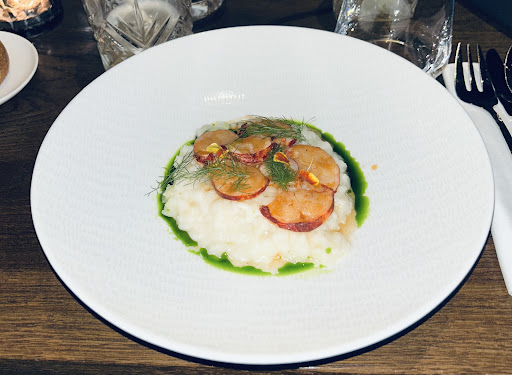 Arrive ensuite un amuse-bouche travaillé comme une petite partition. La truite fumée, à la saveur délicate, repose sur une purée de patates douces à la fois douce et légèrement sucrée. L’émulsion de beurre blanc vient arrondir l’ensemble, relevé par la ciboulette et une huile de coriandre qui ajoute une fraîcheur végétale. Dès ce premier instant, la cuisine du Vertueux révèle son intention : surprendre par des contrastes et soigner chaque détail.