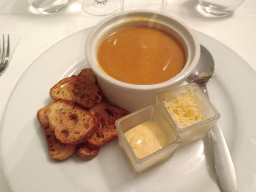 Situated in a nice area. The interior is cosy. You get a little welcome starter. Having asked the waiter if the crab tarama was home made we ordered it and the fish soup for starters. The soup was good. But tarama according to its pink colour and very light flavour was not home made at all. We were very dissapointed because even at a supermarket you can find a better tarama with more percent of cod eggs. As the main dish we both took 'lobster and steak'. The skirt steak that we got was big, tender and cooked the way we asked. In the lobster there was almost nothing to eat. The sauces didn't have any taste. All the dishes missed salt. In the end we were not billed for tarama but still 120 euro for a so so meal for 2 with 0,5 of wine...