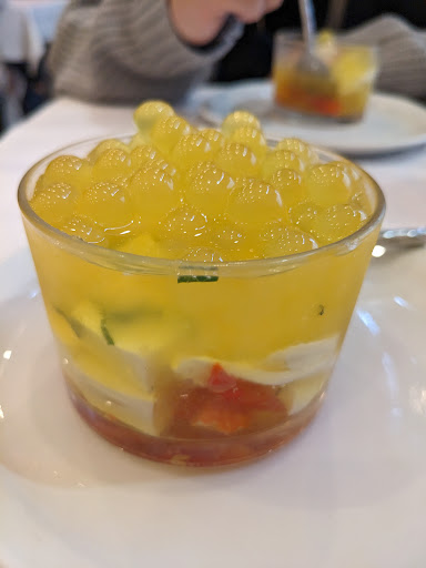 After spending a week in Paris paying 20€ for tiny portions, I expected the 34€ pricetag on the 3 course dinner to mean a small appetizer, a small main dish, and a small dessert. But oh my goodness was I wrong, the 3 course meal had HUGE portion sizes! I have not had to take out at a single restaurant in France before this meal. And it was delicious! The steak was cooked to perfection, and super tender. The mussel pastry for starter was super tasty and filled with seafood. And the final Panna Cotta dessert was super refreshing and fun to eat with popping bubbles! Alas if only I could read the special menu, there were other delicacies like tatare on it that were also very affordable. The owner of the place was also such a sweet and genuine lady. She handled the food with such care. If we were staying in Paris a couple more days, I would have definitely come back to try more items...