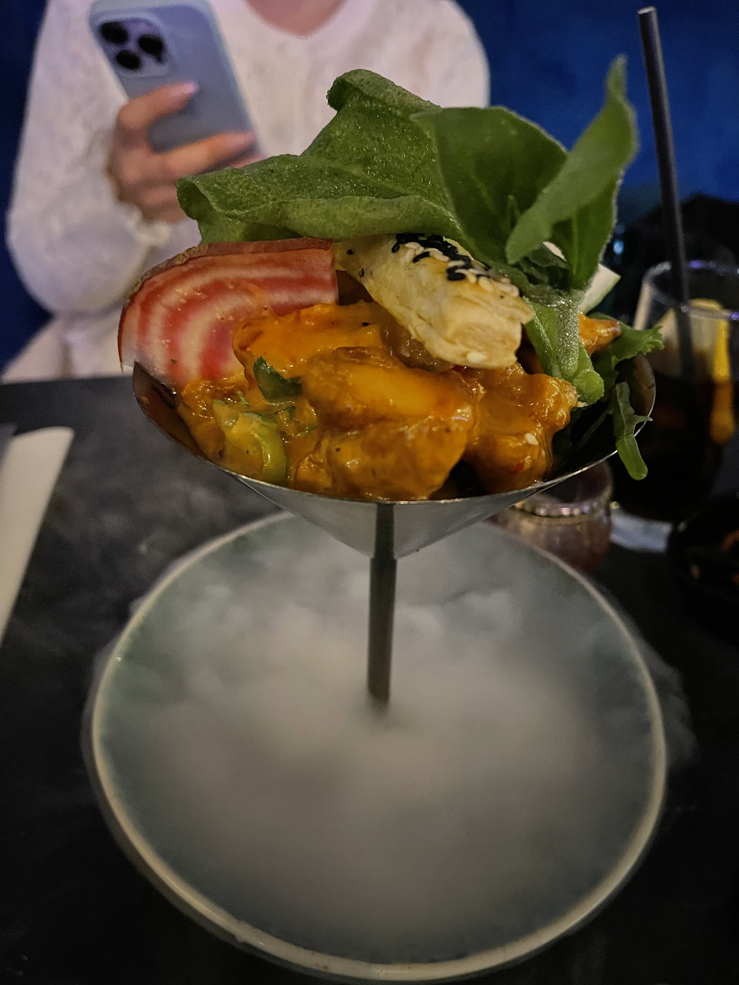 La carte des cocktails est impressionnante, et j'ai eu l'occasion de déguster plusieurs d'entre eux, tous délicieux. Je recommande particulièrement le cocktail bleu, une véritable explosion de saveurs. Les entrées à partager sont également un excellent choix, et j'ai particulièrement apprécié les crevettes dynamites, qui étaient tout simplement délicieuses, ainsi que le carpaccio de bœuf accompagné de sa burrata fondante.
