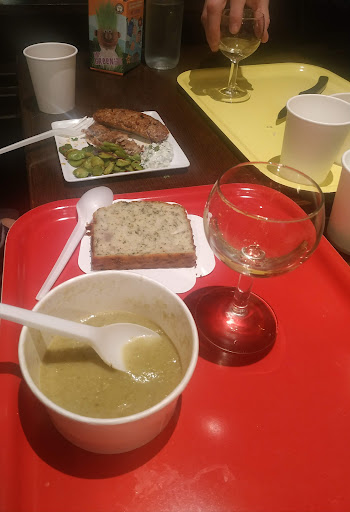 Read moreJe ne comprends pas pourquoi il y a autant de commentaires positifs. On y est allé le soir. En apparence c'est un resto mais en fait aucun accueil, ni service digne d'un resto. J'en ai conclu que ce commerce vit de livraison et à emporter donc ils ont oublié (ou d'ailleurs jamais su) comment on sert dans un resto. Bref, une vraie cantine. Par contre le prix est bien celui d'un resto plutôt cher. Mais avec des petites portions servies dans du carton! Même avec les couverts on voit leur confusion entre resto et cantine: une commande servie avec assiette et couverts normaux mais avec un verre en carton, deux autres commandes servies avec couverts en plastique) On a payé 55 euros pour une minuscule soupe, une saucisse coupée en deux et un petit plat avec viande qui remplirait à peine une poignée, deux petites parts de cake salé (moins réussi que mon premier essai de cake avec une recette trouvée sur internet) et une bouteille de vin aigre (à 25 euros qui doit pas coûter plus que 5euros à Franprix). Dans ce quartier où il y a plein de bons restos pas chers, je n'y...