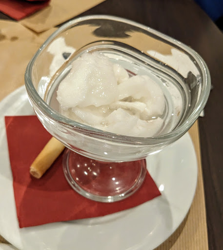 Cependant, j'ai été un peu déçu par le dessert. La glace semblait avoir été décongelée puis recongelée, mais ce détail ne dépend pas du chef, donc ce n'est pas très grave.