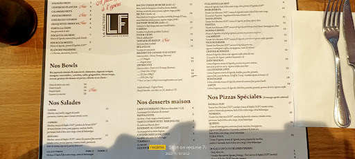 Menus : le midi on ne peut choisir que ce qu'il y'a sur la carte du jour, avec environ 3 menus à 13⏠: Le plat (pour nous c'était soit : Bowl (voir photo du menu) soit MC PAU soit le Factory du jour crée par le chef, mais avec 3 ou 4⏠de supplément.) En dessert 2 ou 3 choix. Café (si on voulait un thé c'etait avec supplément, dommage pour ceux qui n'aiment pas le café).