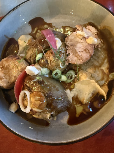 Plat : Échine de cochon, jus a la sauge et Gochujang et Artichaut farci : Premier artichaut farci que je mange et il est excellent, les graines de moutarde et la farce se marient tres bien. L'échine de cochon au Gochujang n'était pas au même niveau. Même si l'échine est parfaitement cuite, l'accompagnement décrit sur la carte ne m'a pas emporté. Cela manquait d'intensité à mon goût.