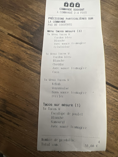 Lorsque nous avons recommandé le tacos en taille L (galette fromage), tacos boulevard nous a appelé pour nous dire qu’ils ne pouvaient pas faire un tel sandwich, preuve qu’ils ne l’avaient pas fait avant et qu’ils ne l’avaient donc pas mis dans la commande.