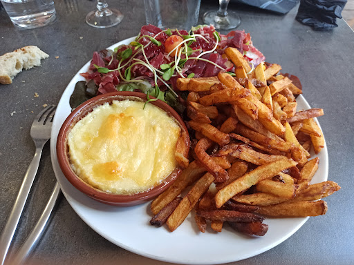 Les enfants voulaient un menu avec brochettes : « y en a plus ». Je commande une entrée : elle sera servie à la table d’à côté, arrivée après nous. Du coup j’ai annulé la mienne… car mon plat était déjà servi. Je commande un camembert : il est bon. Les frites sont bonnes, sans plus. Molles et gorgées d’huile. On prend trois bavettes saignantes. Je les trouve pleines de nerfs. Mais elles sont bonnes. Alors soit…