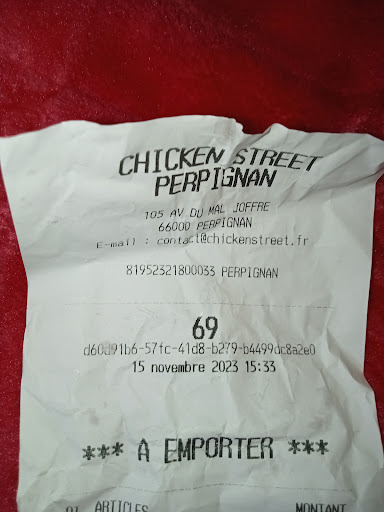 Read moreNous avons pris une grosse commande la semaine dernière pour toute la famille habitué à chicken street dans notre ancienne ville, on attendait l’ouverture de celui ci avec impatience…. Et ÉNORME ÉNORME déception mais vraiment déjà il y à eu 2 intoxication alimentaire sur 3 personnes on voulait prendre pour le petit de 2 ans mais on a rien pris hamdulilah, on a pris des gros seaux de poulet mixte les tenders ils étaient bon mais pas ouff mais les wings un cauchemar ils piquaient de fou mais avec un arrière goût vraiment douteux on en a décortiqué un le poulet mais vraiment il sentait la vieille escalope périmé le poulet était visqueux et tout ça bien caché dans la chapelure alors je ne sais pas si c’est la méthode de conservation ou autre qui n’a pas été respecté car les wings ne sont pas fabriqués sur place mais il y a eu un énorme problème, et puis retourner là-bas pour quoi avoir un geste commercial ou autre ? Non merci c’est malheureux mais chicken street sur Perpignan tire plus sur le chicken chiasse, dommage on mangera chicken street quand on retourna en vacance dans notre ancienne ville mais ici NEVER. Il faudrait songer à avoir un peu plus de sérieux dans le recrutement...