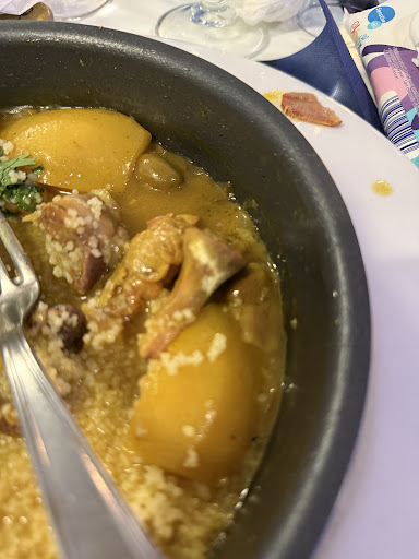 Read moreAccueil froid, serveuse ne nous accompagne pas à notre table (la montre du doigt) Restaurant bruyant (chiens qui aboie sans cesse) Prise de commande rapide et sans sourire Coca zéro servi en verre (sorti d'une bouteille en plastique pour 3euros/verre, sans gaz et sans goût, à se demander si c'est du vrai coca) Un plat de semoule pour 2 (assez pour une assiette/personne (ça reste juste) pareil pour les légumes un plat pour deux (carottes/courgettes/aoignons/celleri/pois criche/tomates) Le poulet n'était pas cuit de l'intérieur, merguez sans goût Je suis sorti avec un mal de ventre, malade toute la soirée, mon mari a vomi toute la nuit (viande pas fraiche) 1 couscous 3 viandes (poulet/merguez/agneau) 18euros et 1 couscous 2 viandes (poulet/merguez) 16euros Je mets très rarement de mauvais avis voir pas du tout, malheureusement c'était une première fois raté, ça sera la dernière Reste cher pour ce qu'on a .. Seule point positif limite c'est la déco (et encore, ça reste quand même sobre) Nous ne reviendrons pas Dommage et bonne...