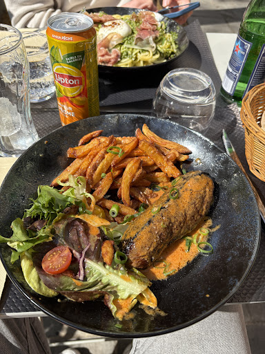 Nous avons été très bien reçus et très vite placés sur la terrasse (attention j’ai l’impression qu’elle se remplit vite quand le soleil pointe le bout de son nez). J’ai pris le magret de canard sauce chorizo c’était un régal, et le magret était cuit à la perfection. Mon collègue a pris des pâtes au pesto, un plat généreux qu’il a eu du mal à terminer tellement c’était copieux.