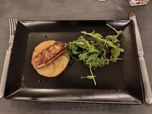 Read moreRestaurant d'une certaine qualité, avec un accueil agréable dans un cadre qui lui ressemble. Après la commande, nous avons eu avec l'apéritif une très bonne mise en bouche. Pour le repas (voir photos) : Une entrée de foie gras (excellente). Un émincé de canard un peu trop cuit à mon goût (dommage !!!). Un gâteau de noix et ses morceaux de pomme avec une crème anglaise (délicieux). Pour terminer ce bon repas, nous avons pris un café. Côté service à table, je dirais particulier. Plutôt que d'avoir un serveur ou serveuse, c'est le chef lui-même qui fait le service, avec un humour un peu particulier (blague à froid sans connaître ses clients). Je ne suis pas fan du service proposé, surtout dans ce style de restaurant. Si vous recherchez des plats fins, dans un cadre plutôt select, vous êtes au bon endroit. Je vous recommande ce restaurant rien que pour la finesse des plats...
