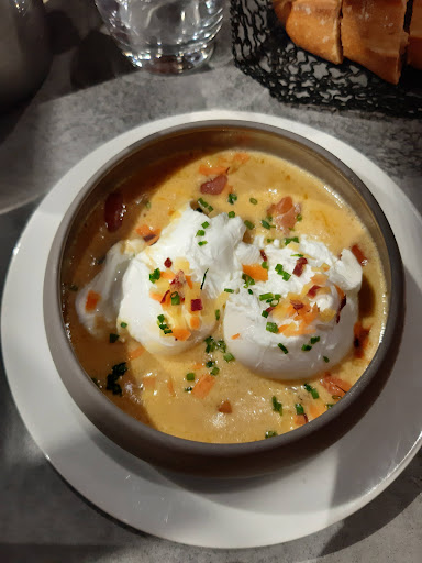 Potage?... Pâtes,lardons, ?... Poison?.... ( seules les deux champignons avaient du goût). Dommage, nous nous sommes cru revenues à déjeuner dans une mauvaise cantine. Par contre. Votre personnel a été fort agréable. Nous pensions venir loger et diner mais, nous allons, plutôt prévenir nos amis et famille de ne s'y plus rendre.... Vraiment, vraiment, dommage. Ce belle endroit, mérite respect, et attention, même pour le déjeuner du midi. Merci d'en prendre note.