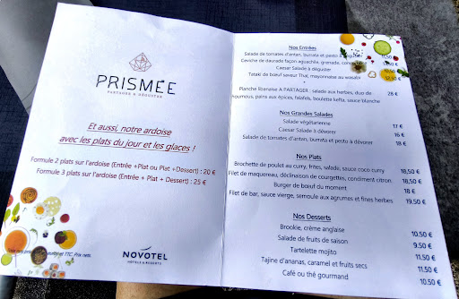 Au bout d'un looong moment on se décide à avancer (on est des oufs), et la personne qui semble être le supérieur (du personnel mais certainement aussi des clients visiblement) nous a demandé de patienter à nouveau de façon froide. On pensait avoir fait quelque chose de mal, mais on s'est aperçus au cours du repas qu'il s'agissait de sa façon d'être. Soit. Une fois installés (la voiture était déjà chargée à 80%...), on a à nouveau attendu un petit moment, alors que le restaurant était loin d'être rempli. Merci au jeune serveur, sympathique et attentionné, lui, d'avoir pris l'initiative d'être venu prendre notre commande. Les prix sont plutôt élevés (autour de 20€ le plat), mais en même temps, c'est Novotel, la carte se veut vite fait "quasigastro", OK. On commande, puis, on attend, on attend, ah mince la voiture a fini de charger à 100 %, il faut aller la débrancher puis la déplacer (je précise que le Superchargeur Tesla se trouve sur leur parking). Moi qui pensais qu'on aurait fini de manger avant la fin de la charge, ça faisait bien 45 minutes qu'on était là...