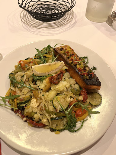 Bon, Restaurant propre, lumineux, déco un peu étrange mais sympa. Belle carte avec du choix (un peu trop de truffe à mon goût). Des formules le midi et le soir. (25€ soir plat+dessert où entrée+plat) J’ai pris un saumon écrasé de pomme de terre et légumes. Très bon et belle portion juste un peu huileux. Mes amis avaient pris des risottos qui étaient très bon aussi ( aux fruit de mer et champignons/noisettes). En dessert nous avions pris un mi cuit au chocolat. Bon il n’était pas mi cuit mais cuit donc un peu déçu et sûrement industriel donc un peu déçu.. Pareil le pain était sec et dur à ce demander depuis combien de temps il était là .. Mojito framboise sans alcool hyper sucré. Les serveurs nous presser a peine arrivé qu’on nous demander déjà la commande. Ils n’ont pas pris de note donc forcément il nous on redemandé notre choix et en arrivant il y avait une erreur on a mangé froid… Dommage que les prestations de service ne soit pas plus minutieuse. Pareil à 23h le restau fermé et on est mis un peu à la porte ou sinon on doit passé dans leur bar donc bof...