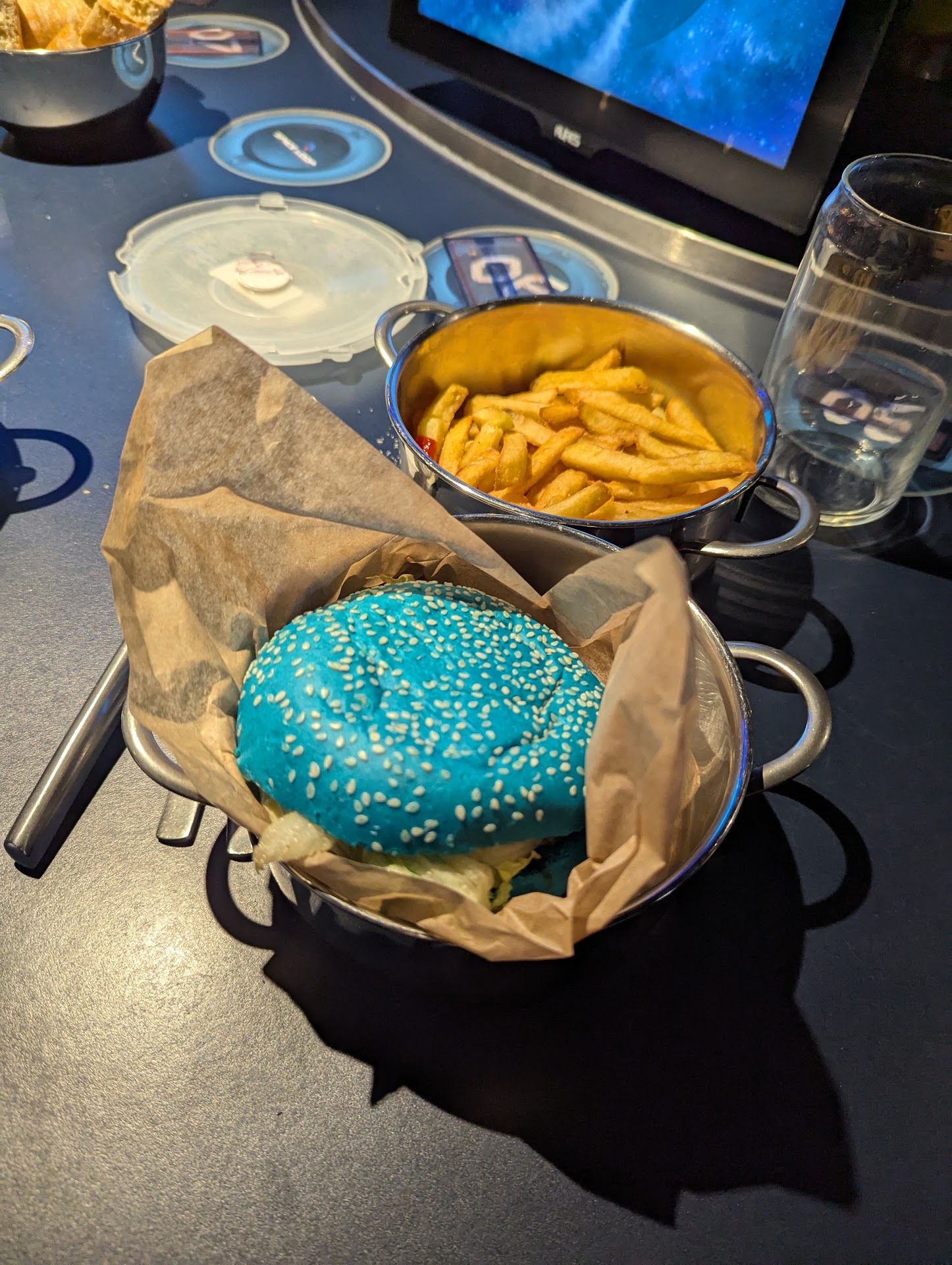 Qui dit journée au futuroscope dit Spaceloop. Parce que le restaurant est attenant à l'hÎtel Cosmos (notre hÎtel pour une nuit), parce qu'il est nouveau et joli, et que la lumiÚre bleue je n'y suis pas sensible ^^. On avait réservé avant et je vous le conseille, parce que c'était plein, un mardi soir en mars hors vacances scolaires. Bon le départ fut chaotique, parce qu'avant 19h, y avait la queue, personne pour nous dire ce qu'on devait faire et les plots pour patienter ont été bougés, mais la personne... est tout simplement partie XD. Et nous a laissés seuls. Bon, évidemment, un peu le chahut parce qu'il faut bien patienter au comptoir avant d'entrer dans la salle pour qu'on nous remette nos cartes. On est installés en bout de table, ce que je préfÚre et un serveur nous explique le fonctionnement. Parfait, on a compris. Le problÚme est qu'en face, j'entends des explications moins claires d'un autre serveur (d'ailleurs cette famille-là aura besoin de mon aide ^^ pas de souci, j'adore aider).