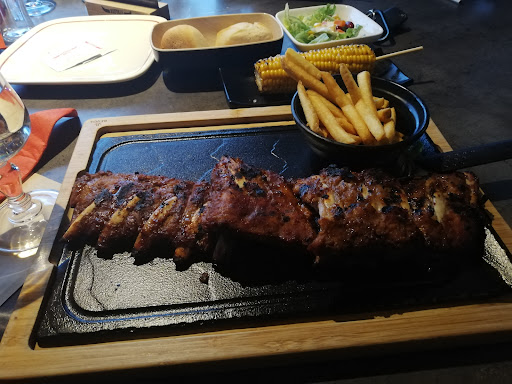 Read moreÇa n'avait pas l'air très prometteur, mais quelle bonne surprise ! En milieu de semaine, à 14 h, dans une zone industrielle, avec des bisons en plastique et, pour couronner le tout, un grill en panne. Ça ne s'annonçait pas bien. Mais nous étions de passage et n'avions pas envie de chercher ailleurs. Nous sommes entrés. Le restaurant était presque vide. On nous a demandé d'attendre qu'on nous trouve une table libre, même si presque toutes étaient vides. On voyait bien que le personnel avait été dressé. Le menu est confus, comme la boutique en ligne Amazon, avec des options partout. Nous décidons d'opter pour les hamburgers et une côte de bœuf. Laine, notre serveuse, vient prendre notre commande. Elle est très gentille et serviable, mais là encore, on sent qu'elle a été drillée. Nous nous demandons si elle a bien compris notre commande. Les boissons arrivent immédiatement, et avant même que nous nous en rendions compte, nos plats sont là aussi. Nous sommes surpris par la rapidité du service. La côte de bœuf n'est pas de première qualité, mais elle est très bonne pour le prix. Je ne pense pas non plus qu'elle avait les 450 g indiqués sur le menu. Mais la cuisson était parfaite et le goût très bon. Les hamburgers étaient délicieux. La viande, la sauce et les autres ingrédients étaient très bons. Une chose nous a frappés : rien n'était salé. C'est une excellente idée. Si vous voulez plus de sel, vous pouvez en ajouter vous-même. Merci ! Et pour finir, notre serveuse « Laine » s'est avérée excellente. Non seulement tout s'est bien passé, mais Laine était toujours là quand nous avions besoin d'elle. Dès que j'avais fini, Laine venait débarrasser la table, parfait ! Merci Laine ! Nous...