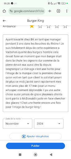 Read moreIncroyable vraiment incroyable Je suis venu il y'a maintenant quelques semaines tout était déplorable d'où mon première avis, vous m'avez répondu que vous feriez tout pour vous améliorer cependant ce soir je décide d'y retourner j'ai pris un double steak housse un classique de BK ! Cependant le montage du burger est une Honte encore une fois ! De plus pas d'oignons frit a l'intérieur savez vous que vous devez mettre 14 g d'oignons frit a l'intérieur au lieu de me refaire un burger on me rajoute un peu d'oignons et on me le ramène regarder la photo ci dessous c'est ça l'image de burger king que vous donnez ? Es normales ? d'ailleurs des cuillères sont conçu pour mettre les bon grammage, le bacon c'est 3 tranches et non pas 1 quand je demande a remettre les ingrédients manquants le jeune au SAT le ramène au comptoir en faisant par de mon mécontentement j'entends au loin la manger du shift dire "ils cassent les couilles" c'est inadmissible. Que vous fassiez des économies sur les Buck c'est tout a fait normal mais pas sur la composition des burgers qui change totalement la qualité gustative de ce burger ! A chaque fois vous répondez au avis en notifiant que vous allez corriger tout ce qui ne vas pas il serait temps de prendre ce burger king en mains c'est une honte pour l'image de la marque ! Deux expériences négatives en l'espace de 3 semaine autant dire que j'ai jetté 50 Euro a la poubelle Sachez qu'un mail de mécontentement et de réclamation sera envoyé au siège a Clichy ! En espérant que vous aurez une visite de BK monde pour vous faire une formation ! Car vraiment je répète c'est une honte! D'ailleurs vous devriez faire un geste commercial ! Et offrir un menu lors de ma prochaine venu...