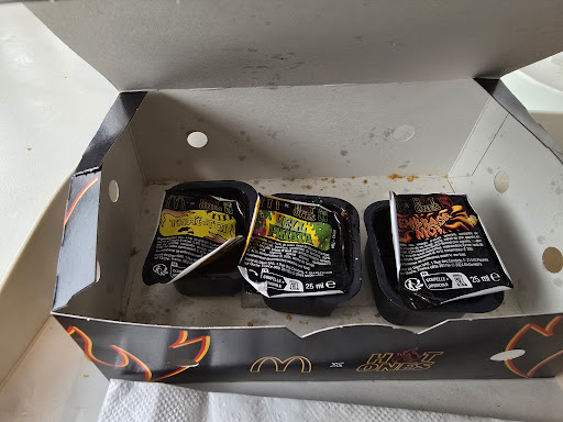 Le service : des erreurs, produits manquants, les sandwichs à moitié de travers, le poulet aussi DUR au point de pouvoir en assommer un cheval ou à s'en péter les dents, rose au centre à cause de la cuisson douteuse, la sauce sur les emballages. Les emballages ont été conçus et créés pour "protéger" en quelque sorte, les aliments consommés, pas pour que la mixture contenue par ceux-ci se retrouve éparpillée dessus...