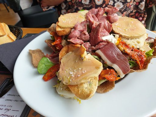 We arrived after 1 pm so had to wait some time for a table so had a drink in the bar. My friends ordered a prix fixe at 28€ and one of them said it was one of the best meals he had ever eaten. I was not so lucky. I started with the terrine du jour which was very tasty and I enjoyed it. I then had the assiette rustique, which was a baked Camembert with toast and strips of poitrine. Everything was very overcooked. I could not get my teeth into the toast, the bacon strips were dry and the texture of the cheese was spoilt. I ate the cheese with fresh bread but left the rest. Shame. I would certainly go back again based on the quality of my friends' food but order...