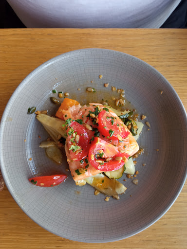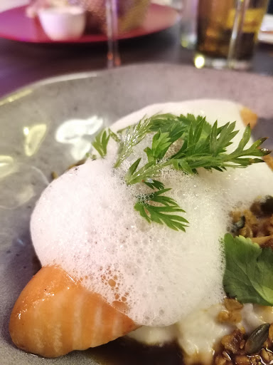 Read moreExpérience très originale et intéressante, le savoir faire et le niveau de technicité du restaurant n'es pas à prouver. Restaurant qui se considère bistronomique, on se rapproche plus du gastronomique que de la cuisine traditionnelle, et ça peut en dérouter plus d'un. Les prix sont correct pour la qualité qu'on a dans l'assiette néanmoins appart les formules du midi il n'y a pas de menu pour simplifier le choix et le prix donc si comme moi vous voulez toucher à tout et prendre entrée plat + dessert vous vous en tirerez hors boissons pour 40 euro. C'est un des seuls restaurant ou j'ai vraiment voulu me risquer sur le choix des plats, et j'ai été agréablement surpris autant par la présentation que par toutes les saveurs présentes dans mes plats. Plusieurs petits points négatif en outre :/, présence de guèpes en abondance même en salle assez désagréable. Et moi 2 / 3 plat était casi entièrement liquide (mousse au chocolat et l'émulsion de tomate confite - citron en entrée), donc même si les saveurs étaient très intéressantes j'ai passé mon repas à la cuillère à galérer à manger mon repas, mais c'était très bon. Est ce que je referais l'adresse pour autant ? peut être pas moi qui préfère la simplicité du traditionnel, j'ai passé un excellent moment mais de là à en fait une cantine de restauration hebdomadaire peut être pas. A faire à tout pris pour se...