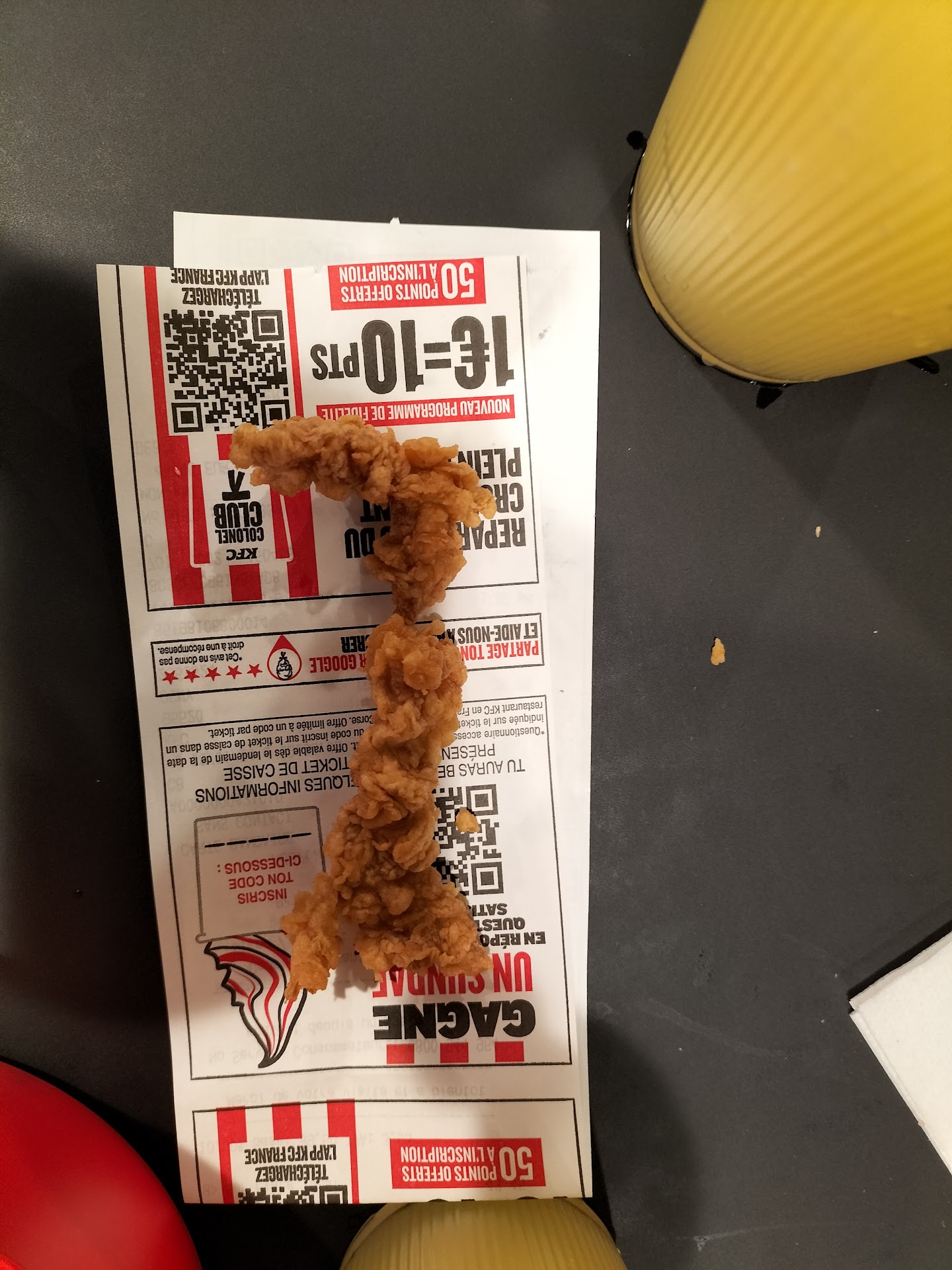 2eme visite: Dans ce contexte d'inflation, KFC a augmenté les prix de manière abusif: exemple de mémoire du bucket 16/16 est passé de 32 euros à 38 euros environ, soit environ 20%. On est dans un marché libre KFC a toute liberté d'augmenter mais KFC ne vend plus le même produit car la taille des tenders et hotwing ont drastiquement diminué ( ci joint une photo de tenders que je trouve de plus en plus petite). En fait si je ramène l'inflation à la quantité, l'augmentation de KFC est probablement de l'ordre de plus de 50%. Faire croire que vous vendez les mêmes produits qu'avant, est synonyme de manque d'éthique dans votre business et ça a d'autres définitions plus juridique. Pire encore, la qualité dégringole avec les quantités. Là on parlait du menu bucket mais tout le reste a aussi chuté en qualité. Je recommande aux clients KFC dont je faisais parti d'aller voir la...