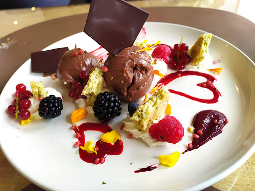 Oui il semblerait que le chef soit totalement passé à côté de son menu du réveillon, une déception culinaire comme rarement j'ai eu. Des mises en bouche qui normalement devraient être servi chaud et sont servi totalement froid, même pas tiédi, peut-être un faux-pas de départ.... mais malheureusement non. Crémeux de champignons au thon fumé? Certes il y avait bien un fond de crémeux mais pourquoi le recouvrir d'autant voir plus de Quinoa ?!... ah oui certainement remplir avec du vide et gagner en coût, ne nous attardons pas sur le cube de thon fumé qui n'en avait que l'appellation et l'option assaisonnement n'était pas retenu pour cette mise en bouche. Entrée 1: pressé de bœuf black angus à la royale, une nouvelle fois le bœuf n'est pas assaisonné dommage pour une normalement viande de bonne qualité, heureusement le condiment d'accompagnement était là pour redonner un peu de goût, le tout surmonté d'une chantilly peut-être foie gras qui est tellement rapidement retombée que je n'ai pas pu la déguster comme telle Entrée 2: médaillon de homard , betterave confite, sauce verveine et citron vert, écume à la fée verte. Par quoi commencer ? Le homard trop cuit , qui est caoutchouc, les betteraves confites qui soient n'étaient pas assez cuites, mais surtout en rien confite pour la partie betterave jaune, juste cuite à la vapeur , quand à la sauce , mais comment peut-on appeler un jus plus proche d'une Saumur ou un rince doigts à l'eau de mer "une sauce "?!?!.... seul point positif l'écume d'absinthe qui était bonne. Arrive le moment du plat principal qui au vu du début de repas ne laissé présager rien de bon, mais qui sait ?! .... et bien non la mauvaise expérience continue, le richelieu de veau, petit légumes glacée et sa sauce cacao cassis, Oh mon dieu , mais pourquoi ? Pourquoi se lancer dans quelque chose qu'on ne maîtrise pas pour le dîner du réveillon ? !?!.... Pour ceux qui ne connaissent pas l'appellation "richelieu " traduit farce de viande , plus souvent d'ailleurs servi en croûte, petit détail.... donc une farce de viande trop poivrée et surtout riche en morceaux de gras désagréable en bouche , le tout nappé par une sauce cacao cassis expérimentale je dirais, légumes, navets, carottes...... Nous arrivons à la seule bonne note du repas , la profiterole de bleu et poire, originale et gustativement bonne. Le dessert au chocolat noisette pas maîtrisé dans son équilibre Et pour finir, un café thermos servi à peine tiède et ces mignardises industrielles ( macarons et cannelé)