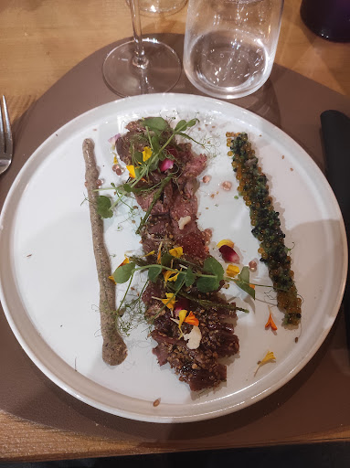 Read moreNous avons été globalement déçus par ce restaurant qui pourtant attirait notre attention depuis un moment. Carte alléchante, façade vitrée très chic, un nom et une situation géographique idyllique mais surtout beaucoup d'avis dithyrambiques. Nous pensions donc que nous allions passer un moment agréable chez un gastronomique à l'ambiance chaleureuse. . Cela manquait énormément de cachet, d'authenticité, d'histoire et de petite musique d'ambiance. Concernant les plats, nous avons commencé par une entrée du menu que nous avons partagé à deux. La gelée du homard n'apportait aucun goût, le biscuit manquait cruellement de croquant, le cumin était inexistant au palais et les carottes étaient bien trop présentes et fade. Pour le plat : Madame a pris le noix de carré de veau. Sans la sauce balsamique, la viande avait peu de saveur bien que rosée et la polenta était fade bien que crémeuse. Les cèpes étaient bons mais on ne sentait pas la truffe. Me concernant, j'ai pris le Cromesquis de boeuf qui m'a fait vite oublier tous les précédents points faibles. Si vous deviez aller dans ce restaurant, je vous recommanderais ce plat à la fois chaleureux, savoureux, croustillant et juteux. Les spaghettis sont cuites à la perfection avec un goût fumé et l'assaisonnement est parfait grâce à une sauce au fond de veau très onctueuse. Le boeuf était très tendre emballée dans une croûte croustillante. Au dessert, nous avions partagé l'Ananas qui figurait dans le menu. Le dessert était frais, les lamelles d'ananas fines et juteuses, c'était très agréable en bouche. Le baba était très bon et le rhum bien dosé. En revanche nous avions été déçus par la crème que l'on a trouvé fade et beaucoup trop consistante. Que ce soit de l'entrée, des plats et du dessert, la présentation dans l'assiette était superbe et originale, et reflétait l'environnement haut de gamme du restaurant. Le service quant à lui était parfait, le serveur était très aimable respectueux et courtois tout en étant réactif et efficace. Le service est rapide et fluide. Nous ne regrettons pas d'être venu, nous avons passé un bon moment, mais nous ne pensons pas...