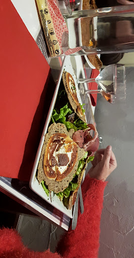 Bonsoir, nous sommes venu manger avec mon conjoint hier et c’était très agréable. La personne qui nous a accueilli était souriant, nous somme de passage pour le week end, nous avons pu lui demandé quelques conseil sur activité dans les environs. Les crêpes était délicieuse: mon conjoint a pris celle au saumon épinard il m’a dit s’être régaler. J’ai pris celle fondu de poireau fromage et noix trop bon puis un bon dessert c’était succulent. J’aurai juste bien repris une autre crêpes salé j’avais encore faim mais je n’ai pas osé le dire. Dans tout les cas je recommande ce resto si vous êtes de passage