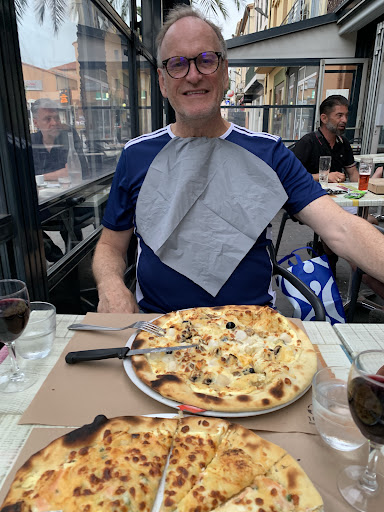Here we are again. At a basic drinking man’s bar, that initially looks rough but we discovered this place 7years ago and I tell you what it is fantastic . The food is brilliant. My fav I have on every visit each year is pizza with salmon, creme freche, emantale cheese and dill. Sooo good. Half carafe of vin rouge and pistachio icecream. Oh we had a salad too. Toilets as all toilets in France 0/10 unisex. Food...